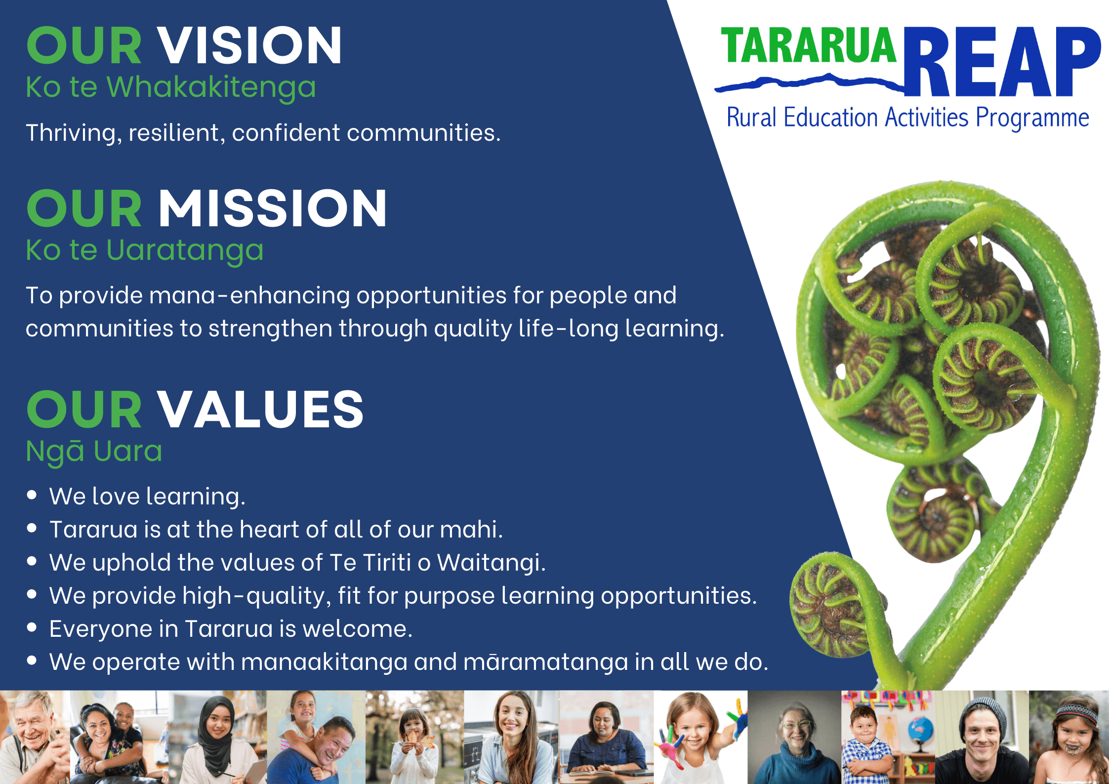 We provide inclusive, high-quality education and support services that empower individuals and whānau at all stages of life. Rooted in the values of Te Tiriti o Waitangi, we bring people together, share knowledge, and create opportunities that are innovative, practical, and designed for the future of Tararua.